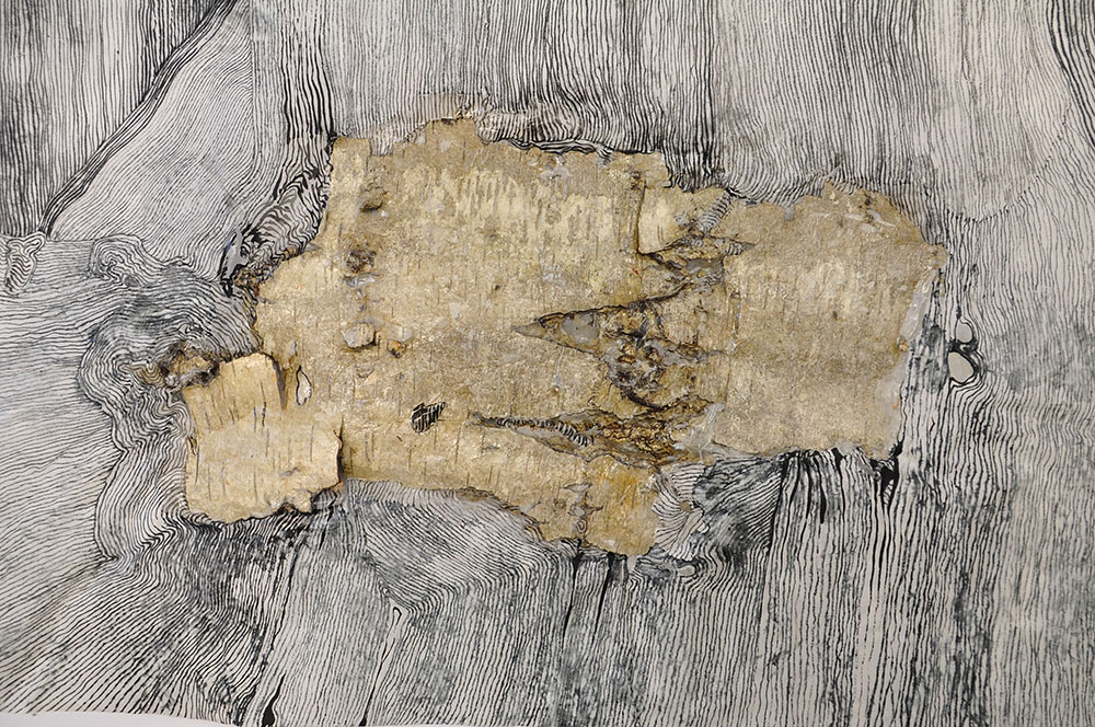 collage: inkt op rijstpapier en berkenbast
