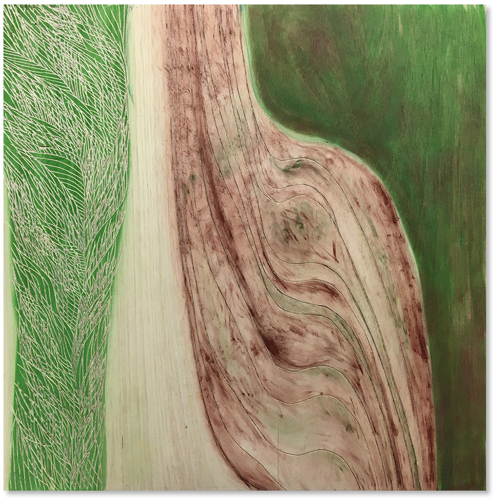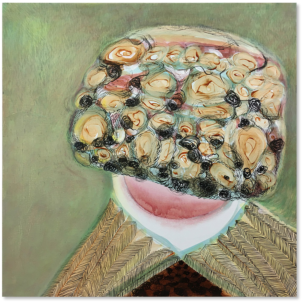 gesso, inkt, grafiet en print op houten panel