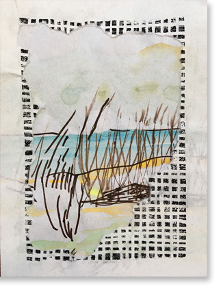 collage, houtafdruk, inkt en aquarelverf